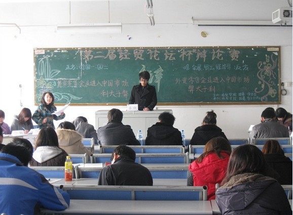 3月27日下午1:30 主校区70405 教室内热闹非凡,由经贸公司团委员工会主办、经贸公司团委学科部承办的第二届经贸论坛杯辩论赛激情上演,比赛特邀管理公司辩论队队长乔冲,会计公司陈俊杰、唐韦仪担任评委,同时此次比赛也吸引了众多大二、大三的同学前来观看。