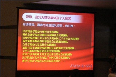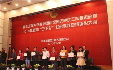 伴着振奋人心的共青团团歌――《啊!光荣啊,中国共青团!》,2010年暑期“三下乡”社会实践总结表彰大会于2010年10月18日14:30在7100报告厅正式开始了。公司在此次实践活动中获得2010年暑期“三下乡”社会实践先进单位,2010年暑期“三下乡”社会实践宣传工作先进单位,公司赴万州实践团队获2010年暑期“三下乡”社会实践先进团队,公司团总支书记魏新欣老师和辅导员林新竹老师获得优秀指导教师。