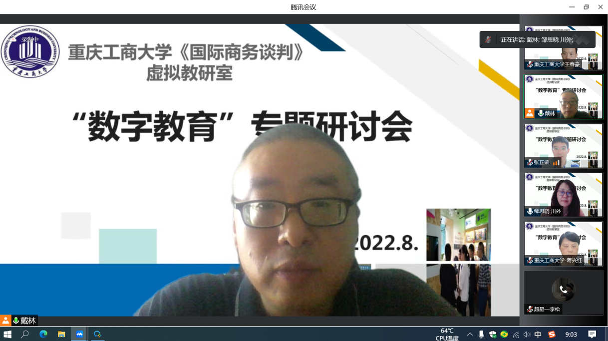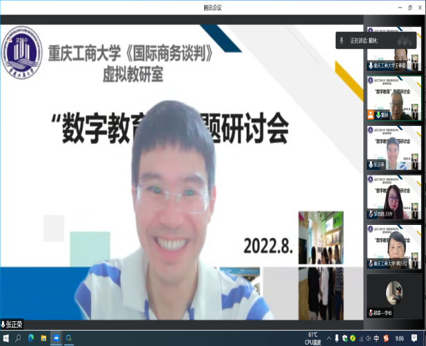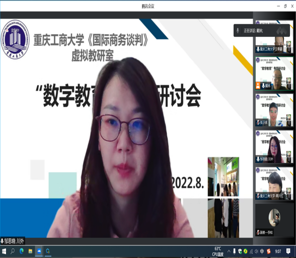 2022年8月19日,K1体育官方网站校级虚拟教研室,《国际商务谈判》虚拟教研室“2022数字教育专题研讨会”在腾讯会议平台成功举办,会议由教研室负责人戴林副教授主持,校外成员浙江理工大学管理公司跨境电子商务研究所所长张正荣、四川外国语大学国际金融与贸易公司国际经济与贸易系主任邹思晓以及校内成员蒋兴红、王春豪、冉梨等老师参加了会议,特邀超星公司李松、张秋林和刘文静老师参加研讨。