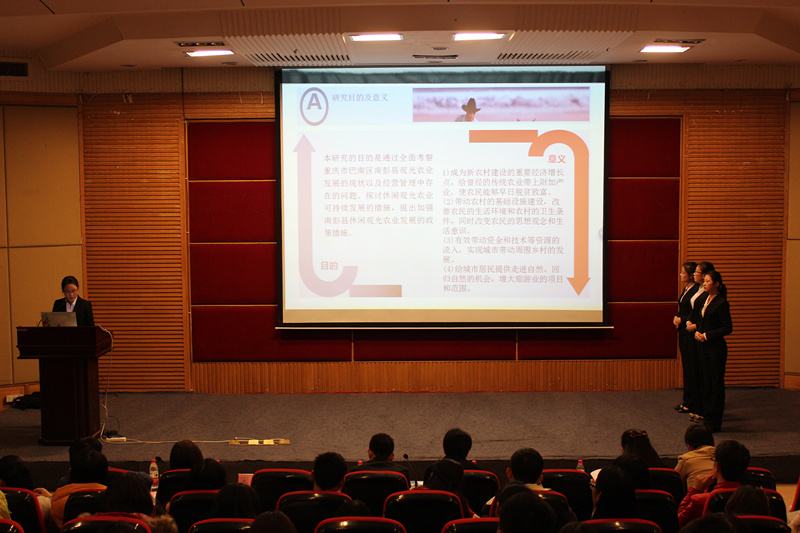主持人致开幕词并宣布比赛开始,比赛环节分为“风采展示”、“调研报告” 和“嘉宾点评”。各参赛队伍分别展示了调研过程中的独特风采后,进入本场最重要的调研报告展示环节,其中关于重庆巴南区南彭镇农业专业合作社发展情况调研、巴南区都市观光农业发展路径调研、以及农村“空巢”老人生活状况及养老对策的调研等调研课题都紧贴社会民生;正如雷菁副书记所言:“本次活动打造了优秀的团队,达到学以自用的效果,本次活动打开老员工关注民生的渠道,发展老员工全面素质。”最终,“湛蓝梦想”队凭借全场最高分赢取决赛一等奖。