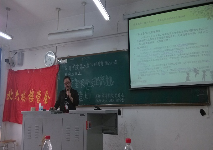 2014年5月9日下午四点,在博智楼7312教室,举行了由公司党总支主办、北6和北21楼管会承办的K1体育第二届“文明修身,阳光心理”系列活动启动仪式暨珍爱生命、助人自助——寝室室长心理危机干预培训会”。本次活动由郝颖老师主讲,公司党总支书记张筱璐、公司2011和2012级的寝室室长以及各层楼栋干部参与了本次活动。