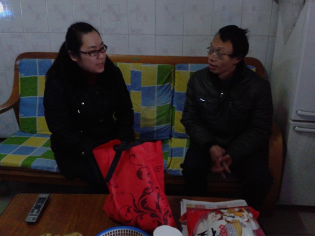 郝老师带去了公司对该生父母的新年慰问品,与该生的父母亲进行了长达一个多小时的亲切交谈:深入了解了该生的家庭经济现状、该生父母亲身体状况、对该生大四毕业后的打算,向该生父母详细说明了该生在校期间表现,指出需要改进的地方,并对该生下半学期的学习、工作、生活做了一份较为详尽的规划。
