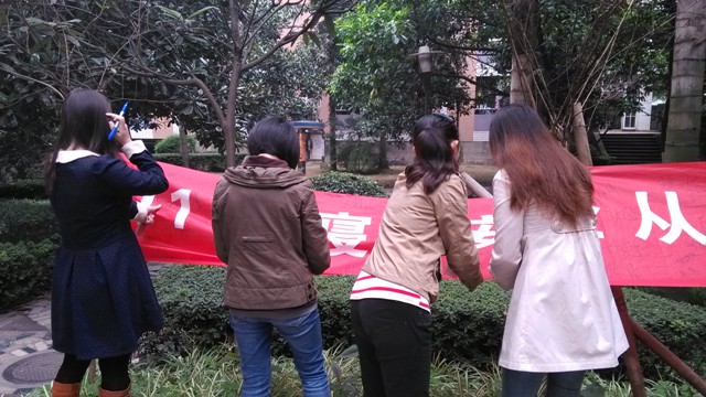 上午十点左右,北六楼管会的成员在北六栋楼下拉上了一条横幅,提醒寝室成员注意防火、安全用电。在活动过程中,进出北六楼栋的同学们都要在横幅上签字,同时楼管会成员们会认真地向同学们讲解该如何在宿舍内安全用电,使每个同学都能够明白地了解到寝室安全用电的重要性。