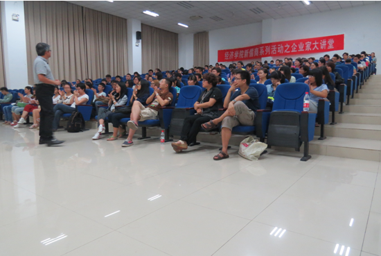 本次“企业家大讲堂”活动的主题是“从优秀到卓越,做不可替代的人”,Frank首先讲述了从自己中学时不为优秀的学业考试,年轻时不尽如意的工作体验,再到如今成功任职海联达培训长岗位的曲折成长故事,真实地反映了一个优秀企业家成长过程中所经历的风风雨雨。演讲过程中还穿插地让同学们观看了老鹰重生、阿姆斯特朗首次登月、以及菲尔普斯游泳夺冠等多个激励人心的视频,启迪大家在大学的成长过程中学会挑战自己,超越极限,发挥潜力,坚持不懈。此外,Frank和同学们之间进行了多次互动,向大家提出了诸如“你想活到几岁”、“你老了之后将选择如何养老”等多个引发大家深思的问题,同学们畅所欲言,各抒己见,与Frank亲切交流。最后,Frank指出了社会实践过程中所需的“三大模式”、“七种能力”的重要性,希望大家在以后的学习和工作生涯中,重视新工作,换位思考,发挥创造力和个人天赋,做一个成功的人。Frank幽默的话语,独特的演讲风格,赢得了大家的掌声,演讲过程中他还不时向在场同学派发小礼品,促进了同学们的积极性,使本次活动多次达到高潮。