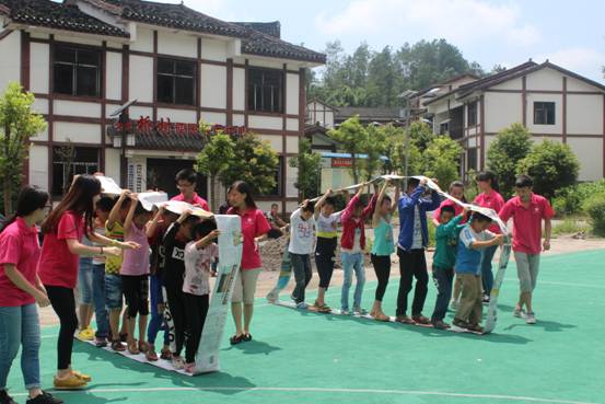 当天下午,实践团成员为孩子们带去了一场充满趣味的素质拓展活动。在“无敌风火轮”、“地雷阵”、“盲人足球”等团体活动项目中,孩子们玩得不亦乐乎,现场充满了欢声笑语。在轻松愉快的氛围中,孩子们彼此距离拉近,体会到了和其他人团结合作、互相信任的重要性,相互合作取得的成功更有意义!