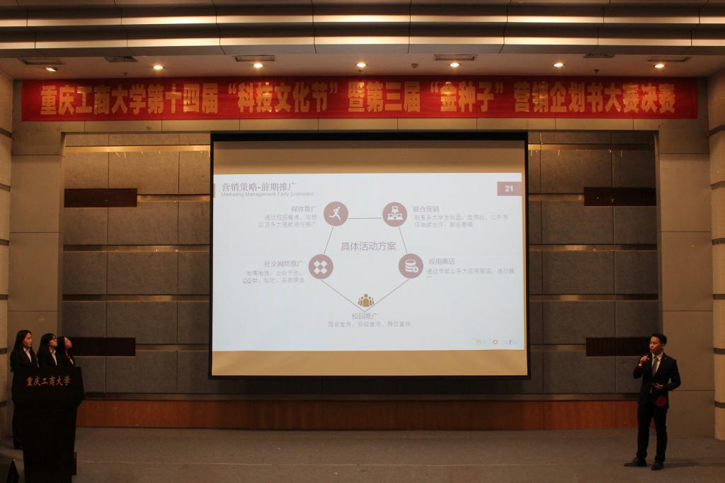 金种子从2013年开始举办至今,一直秉持“以赛促训、赛训结合、训战结合”的思路,不仅有企划书大赛,还结合大赛获奖项目开展针对性的创新创业培训、创业实战演练等,让同学们在校期间将理论与实践有机结合,切实提高创业能力,得到了同学们的广泛响应和积极参与。60多支队伍历经初赛、复赛的磨练,最终A.one鲁卡米、重商学塘等六支参赛队伍进入决赛比拼。本届“金种子”营销企划书大赛以“智能社区智能校园”为主题,以电子平台为主要营销渠道,激发同学们不断创新的创业潜力。决赛共包括创业项目PPT展示、现场答辩以及现场销售三个环节。在项目展示中,参赛队伍准备充分,从产品与服务、市场分析、营销战略和推广形式等多个方面对团队及项目进行了介绍和推广。在现场销售环节中,各支队伍现场抽取产品,对现场的评委们进行销售。同学们通过大胆的表现、新颖的销售形式,自信灵活的处理和面对销售中的重重困难,最终成功销售处自己的产品。最终,A.one鲁卡米团队凭借优异的表现获得一等奖,获得员工资助的创业基金3000元。赛后,张东祥教授对大赛进行了点评。他首先对这六个项目进行了点评,肯定了同学们的精彩展示。随后从策划书的书写、项目的选定、资金的来源以及项目的推广等多个方面给同学们做出了专业的指导,希望同学们可以选择更宽阔的视野,进行更广泛的选题,并增加市场调研,使营销企划更具可行性。