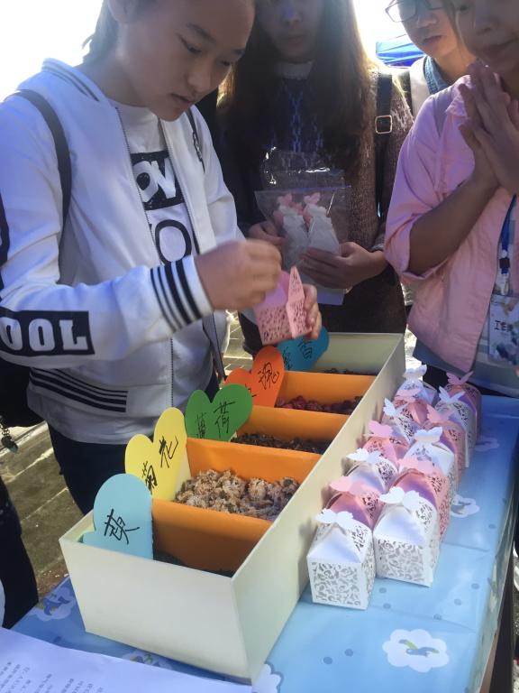 此次活动根据重阳节传统习俗,精心设置四个环节,分别为:诗情话“忆”、“彩菊”南山、万里登“糕”、花语心香。诗情话“忆”,佳节又重阳,诗词拼接追远重阳风骨,广大师生充分调动自身古诗文知识,展示出不凡诗书才华,诗词拼接后的书法展示,更是吸引来了退休教师洒脱挥豪,笔力劲挺,赢得现场掌声阵阵。陶然共醉菊花杯,通过讲解猜出菊花的种类,极大的考验了老师同学们的记忆和观察能力,也增长了辨别菊花的知识。登“糕”望远,特制重阳百事糕,寓意百事顺利,将不同水量瓶子垒起,体会游戏乐趣的同时,更寓意“步步登高”的好兆头。玲珑剔透璇玑手,自制茱萸香包,现场在规定时间说出关于花和花名的诗句,即可根据个人喜好,在精美的香包中加入玫瑰、茱萸、薄荷等香料,让参与者满心欢喜来,满身馨香走。活动现场四个环节环环相扣,精心设置的游戏加上工作人员细致的讲解,极大的调动了同学们和老师的积极性,尽管夹杂着小雨,却浇不熄师生们参与的热情,大家排队做游戏,争相合影留念。