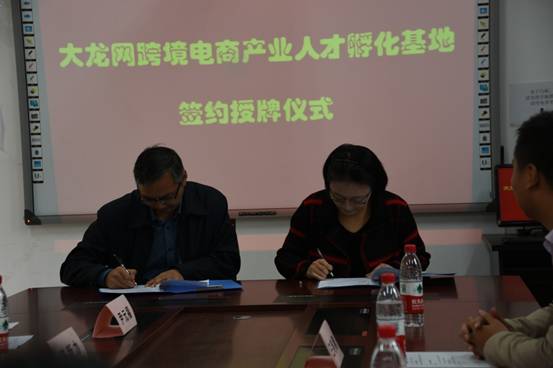 仪式在热烈的掌声中开始,张筱璐书记代表公司致辞,表示双方战略合作,将公司国际经济与贸易专业人才培养优势与企业的产业优势进行充分整合,有利于推进公司人才培养模式改革,提升专业办学水平与开放办学程度,有利于人才与企业的对接及企业发展战略的实现。高海鹰经理对公司、公司高效务实的合作表示了高度的认同与赞许,并对下一步的合作进行了期许与展望。接着,陈新力经理与高海鹰经理分别在协议上签字、交换文本,并共同为“大龙网跨境电商产业人才孵化基地”揭牌。
