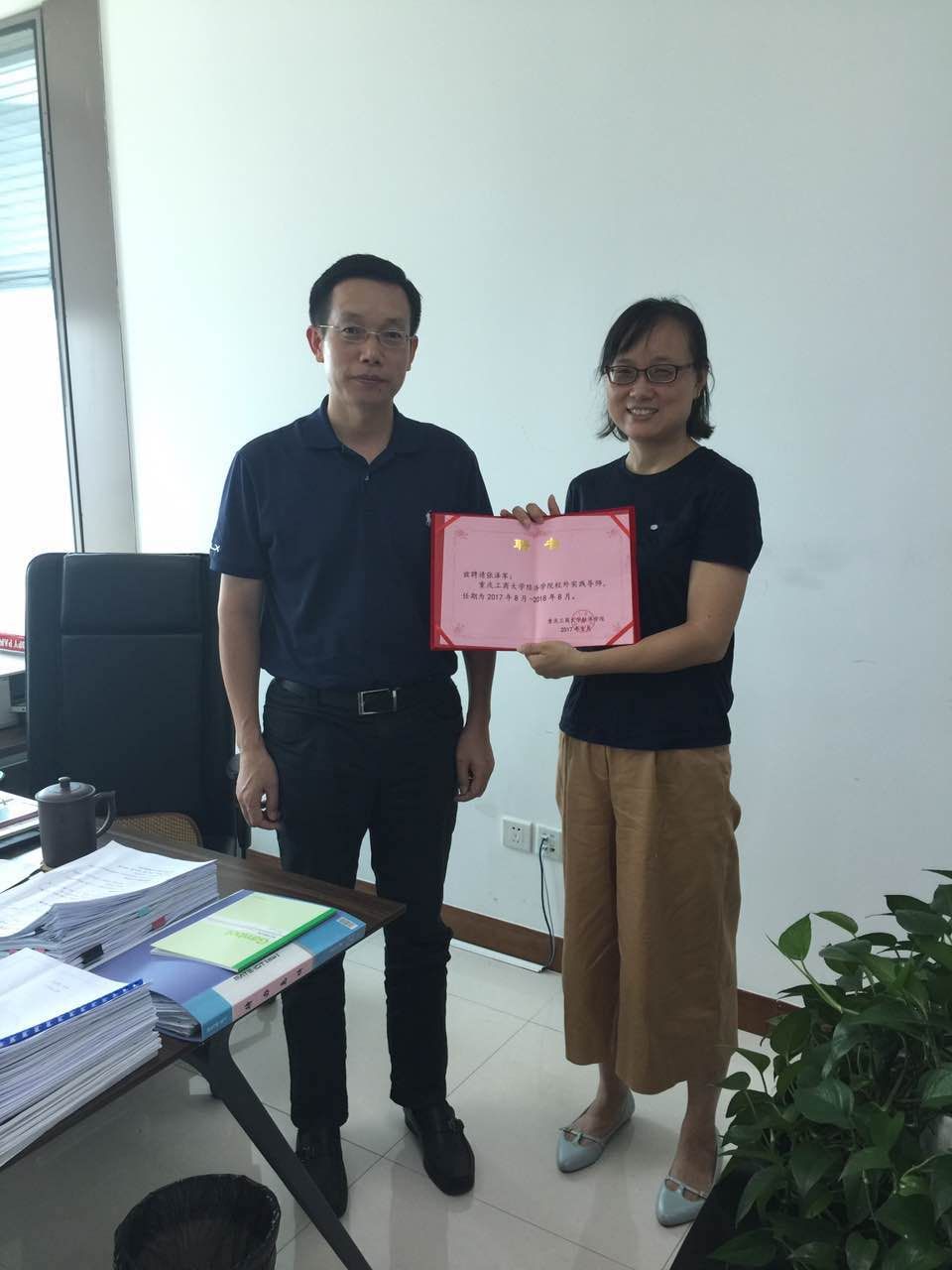 重庆商社集团组织人事部经理,重庆百货组织人事部经理张泽军对公司教师的到访表示欢迎,并为我们详细介绍了重庆商社集团近一年来在人事和绩效方面所做的改革;人事部的相关领导为我们讲解了重庆商社集团2017年11月份的人才引进计划,以此为基础,我们与商社集团就集团的培训、人才引进和未来双方在实习实践方面的合作意向和合作模式进行了深入的探讨,初步形成了深入合作的合作框架,同时,张泽军经理聘请为贸易经济专业校外实践导师,并为张总颁发证书。
