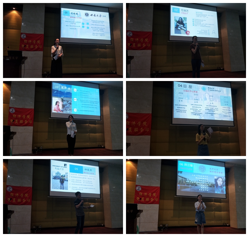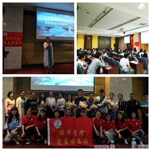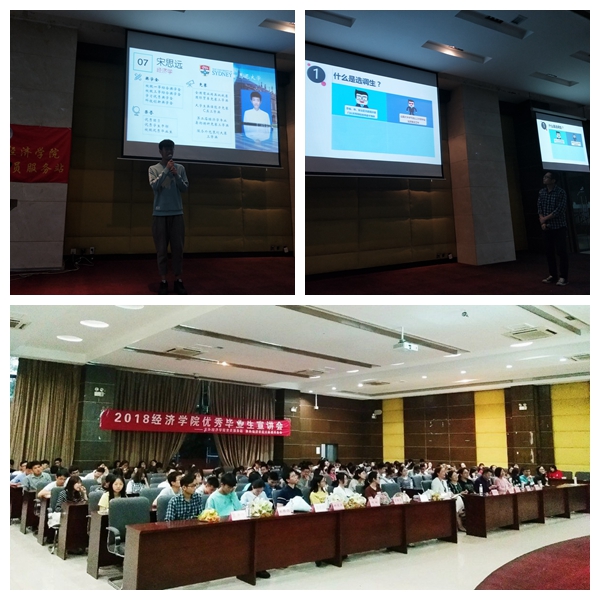 接下来,八位优秀毕业生的经验分享会在党员服务站优秀成员为学姐学长们献上鲜花后徐徐展开。来自14国贸专业的肖程钱、韩汶橦和来自14会展专业的田甜各自向同学们分享了她们的考研之路,她们认为“考研不是一个人的孤军奋战,更多时候是一场信息战,在大数据时代能迅速收集到别人未知的信息,你往往就能够占领先机”。来自14贸经专业的任培艺分享了她求职与实习的经历以及银行网申和填写简历的建议。来自14经济学专业的宋思远和14国贸专业的钟俊涛分享了他们的大学四年的经历和申请出国留学的经验。来自14经济学专业张梓涵和龚德平学长各自讲述了他们考取公务员以及考取选调生的经历和感悟。