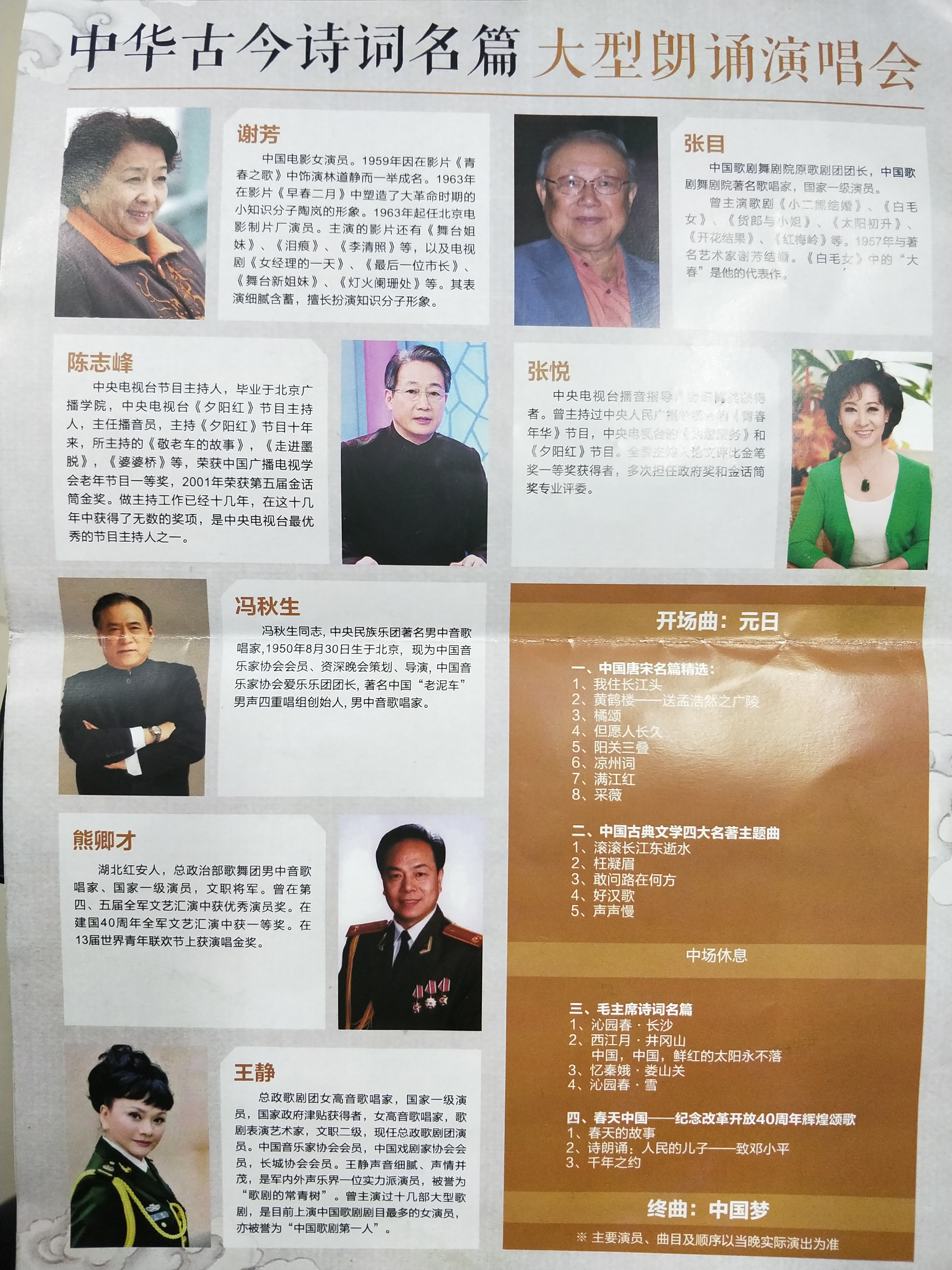 中华文化源远流长,诗词文化博大精深。此次演出分为四个篇章:《中国唐宋名篇精选》、《中国古典文学四大名著主题曲》、《毛主席诗词名篇》、《春天中国-纪念改革开放40周年辉煌颂歌》。在演出的两个多小时里,现场的观众静心聆听着艺术家们在舞台上朗诵、演唱经典诗词和歌曲,大家被台上的演出所吸引。尤其是当82岁高龄的老艺术家谢芳朗诵时,观众们被她的专业和精神打动,台下爆发出了雷鸣般的掌声。