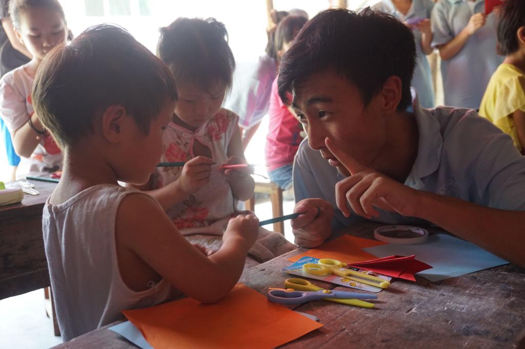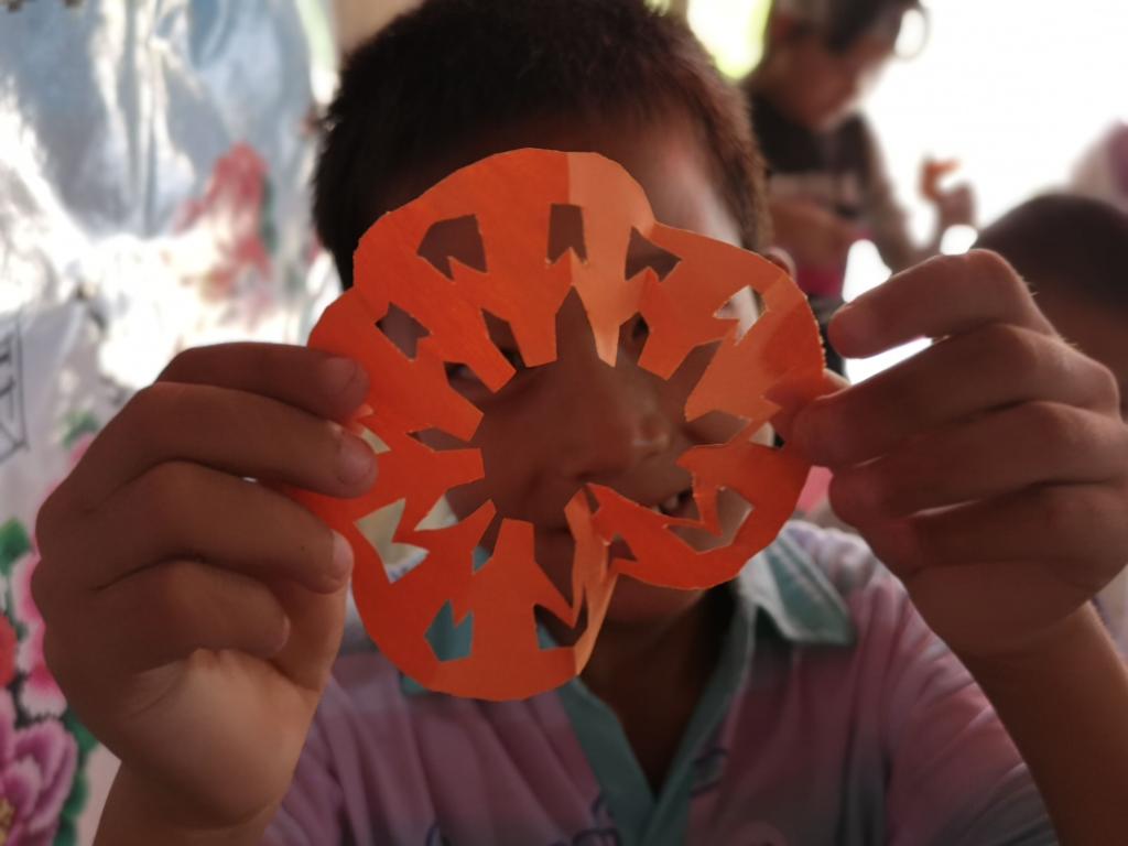 实践队员们用事先剪好的窗花勾起孩子们的兴趣,开始给孩子们简单讲解窗花的来源。窗花是贴在窗纸或窗户玻璃上的剪纸,中国古老的汉族传统民间艺术之一。实践队员在黑板上细致地画出剪纸图案,耐心地教他们剪纸。孩子们坐在课桌旁一会抬头认真听讲解,一会又拿着手中的铅笔低头认真地画着。孩子们一丝不苟地画着,一切只为能够送给爸爸妈妈一份完美的剪纸作品。画好要剪的图案后,孩子们在实践队员的引领下进行最后一步:将画好的图案剪下来。小小的手掌,厚厚的剪纸,但小朋友们并没有觉得剪起来费劲,有的只是心中准备礼物的喜悦。剪完之后,小朋友们小心翼翼地展开自己的作品,兴高采烈地挥舞着他们的美丽窗花向实践队员们展示。