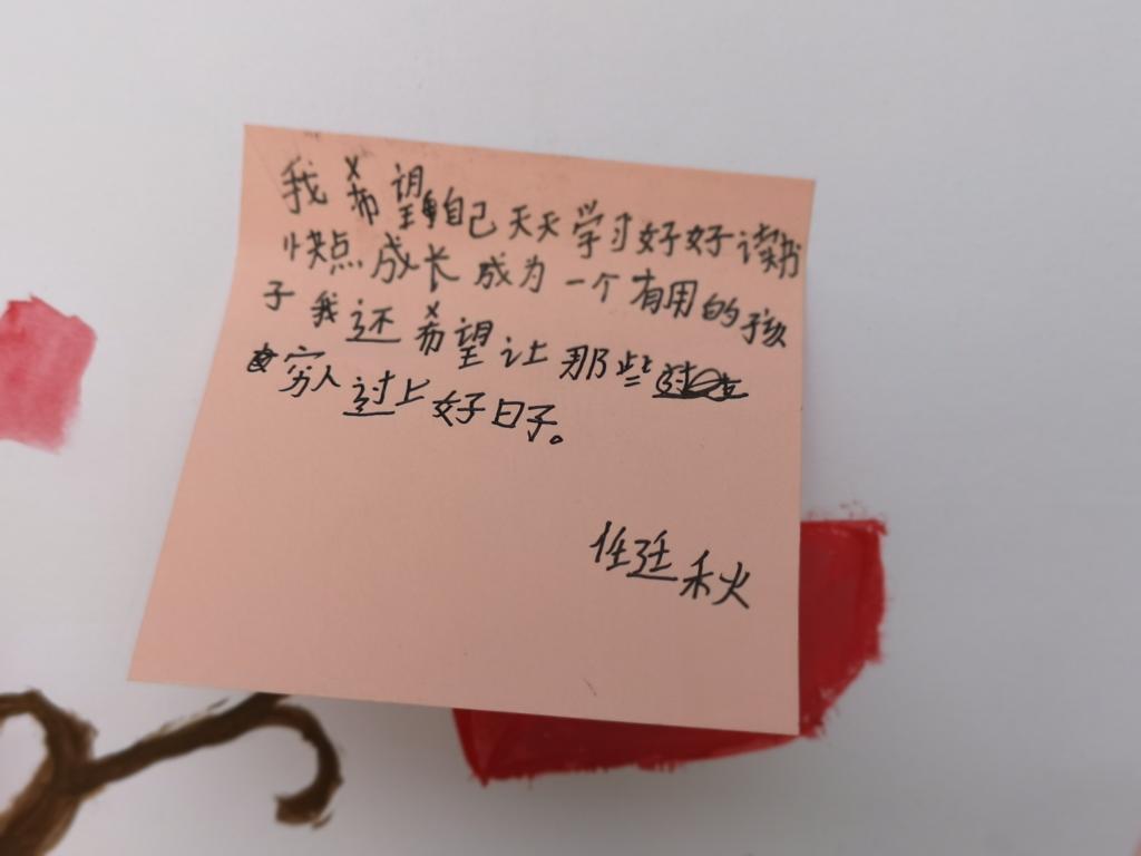 为了更好地帮助这些孩子,K1体育定期给这里的孩子寄出爱心包裹。今年暑假,K1体育实践队成员们再次来到营盘村小学,开展了为期一周的教育关爱活动,其中为了更好地开展爱心包裹项目、了解孩子们的需求,实践队员们特地准备了“心愿树”活动。活动伊始,孩子们安静地坐在座位上,等待实践队员们为大家分发笔和纸。孩子们拿到笔后,实践队员在一旁耐心地与孩子们沟通,逐步引导孩子讲出自己的心愿,孩子们低头认真地在纸上写着自己的愿望。写好自己的心愿后,孩子们小心翼翼地将心愿纸贴到心愿树上,两只小手用力地将它粘在上面,期盼着他们的愿望能够早日实现。