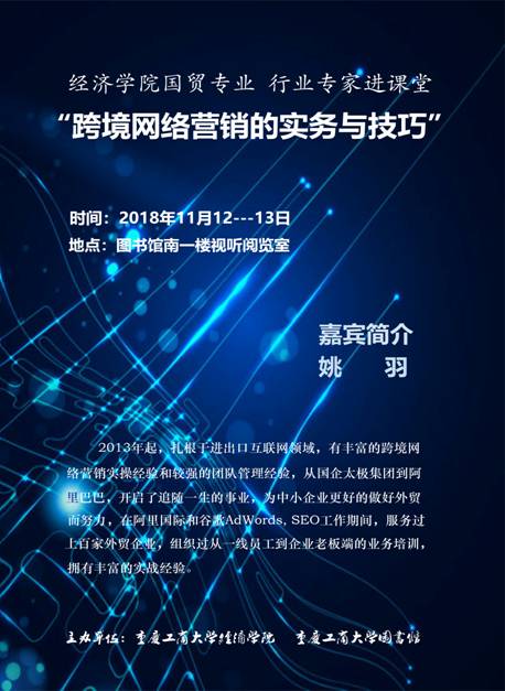 2018年11月12日-13日下午,由K1体育和图书馆主办,K1体育国际经济与贸易系承办的国贸专业“行业精英进课堂”活动在图书馆一楼视听阅览室举行。该活动是K1体育为“推动人才培养模式改革,促进政产学研深度合作”打造的精品课堂,自推出以来,获得公司师生的好评。本次活动邀请了跨境电商行业精英姚羽老师,图书馆戴林副馆长,国贸、贸经等专业160余名同学参加了此次活动。