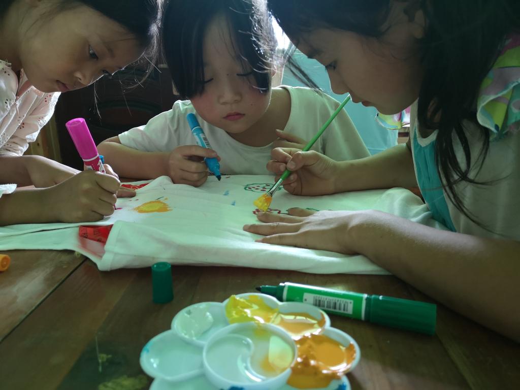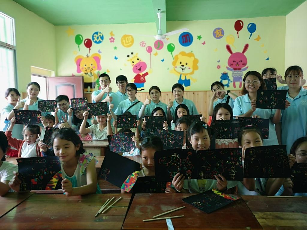 手工课拉开了此次实践活动的序幕,接到一张张空白的卡纸,孩子们手握画笔,发挥想象,创造出一幅幅充满童趣的刮画,每一份作品都折射了孩子们的内心的美好世界。在创意课上,通过实践队员们的引导,孩子们纷纷巧妙构思,在纯白色T恤上编织自己的童话世界:可爱的长颈鹿、火红的爱心、绚丽的彩虹……那是孩子们的美好天地,每一种图案都表现出孩子们对未来的憧憬与期待,对美的追求。