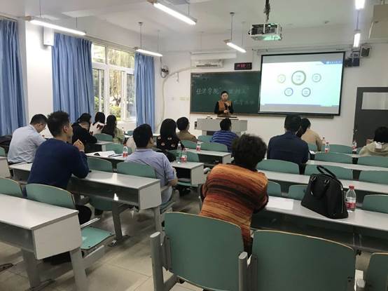 活动第二阶段包含新进教师说课、骨干教师教学创新示范课、骨干教师教学经验分享三个环节。第一环节中新进教师代表邹圆老师、彭青青老师代表分别展示了《策略性广告》和《计量经济学》的教学设计,并对课程内容进行讲解。第二环节为市级比赛参赛教师创新示范说课。其中,孙畅老师通过《西方经济学》教学示例着重讲解了课堂组织以及教学内容传授的创新形式,鼓励开展项目式教学等新兴教学模式;张驰老师演示了雨课堂的使用,示范线上线下混合教学的优势;刘晗老师就《区域经济学》课程思政内容做分享,探讨习近平新时代中国特色社会主义经济思想进课堂。第三环节由校级教学竞赛获奖者张文爱老师围绕教师应如何站好讲台这一话题,从热爱、尊重、专业和方法四个维度对教学经验进行了分享。
