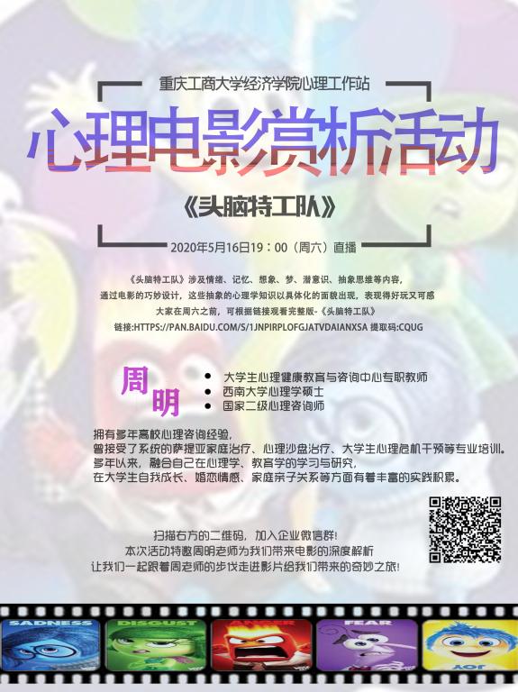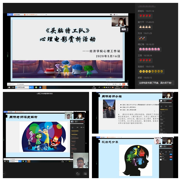 活动过程中同学们积极发送弹幕,气氛十分热烈,活动进行了大概五十分钟,随着主持人的活动到此结束而圆满落幕。“当情感有了颜色,我们需要去拥抱它们,不管是愤怒还是喜悦,或是悲伤,通过思考,让我们的心灵涂上有生活气息的色彩,我们才能成为一个真正的人”,也如电影所说,每一个情绪都有独特的意义。心理工作站希望通过欣赏、讨论、感悟电影,让同学们思考现实生活,正确认识、对待各种情绪,正确表达、调节自己的情绪,重新认识自己,活出完整自我,拥抱自信人生。
