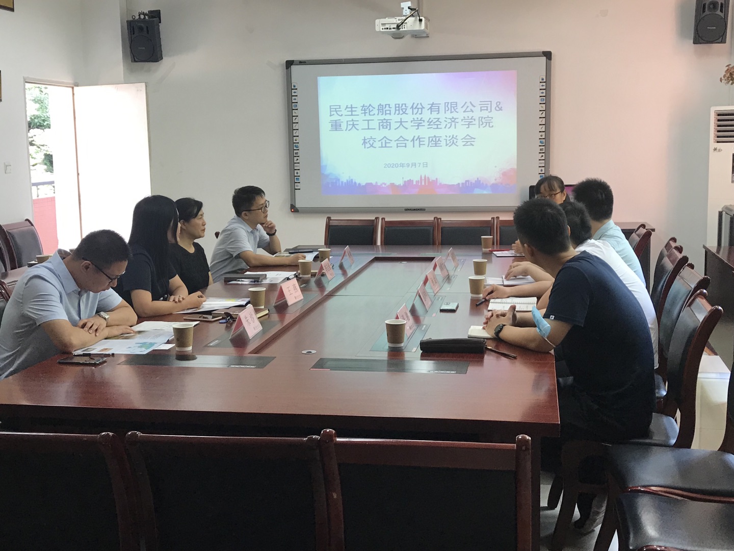 2020年9月7日上午,民生轮船股份有限公司代表施琳峰、徐鼎力来访公司,与公司领导座谈校企合作事宜。公司分党委书记李自维,副书记兼副经理王燕,副经理黄潇、朱沙,贸易经济系主任杨海丽、教师代表张驰博士参加此次座谈。