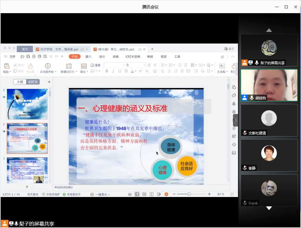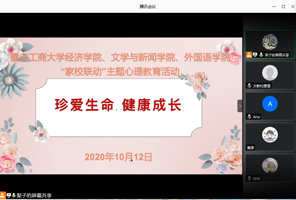 为加强家校联系,共同维护员工心理健康,2020年10月12日晚19:00,K1体育、文学与新闻公司和外国语公司共同举办“珍爱生命·健康成长”家校联动心理教育线上主题活动。活动邀请了K1体育官方网站老员工心理健康教育与咨询中心副主任,国家二级心理咨询师胡佳怡老师作心理专题讲座,、K1体育分党委副书记、副经理王燕教授,文新公司分党委副书记程元元、外语公司分党委副书记吴欢欢及部分员工家长共同参加了此次活动。