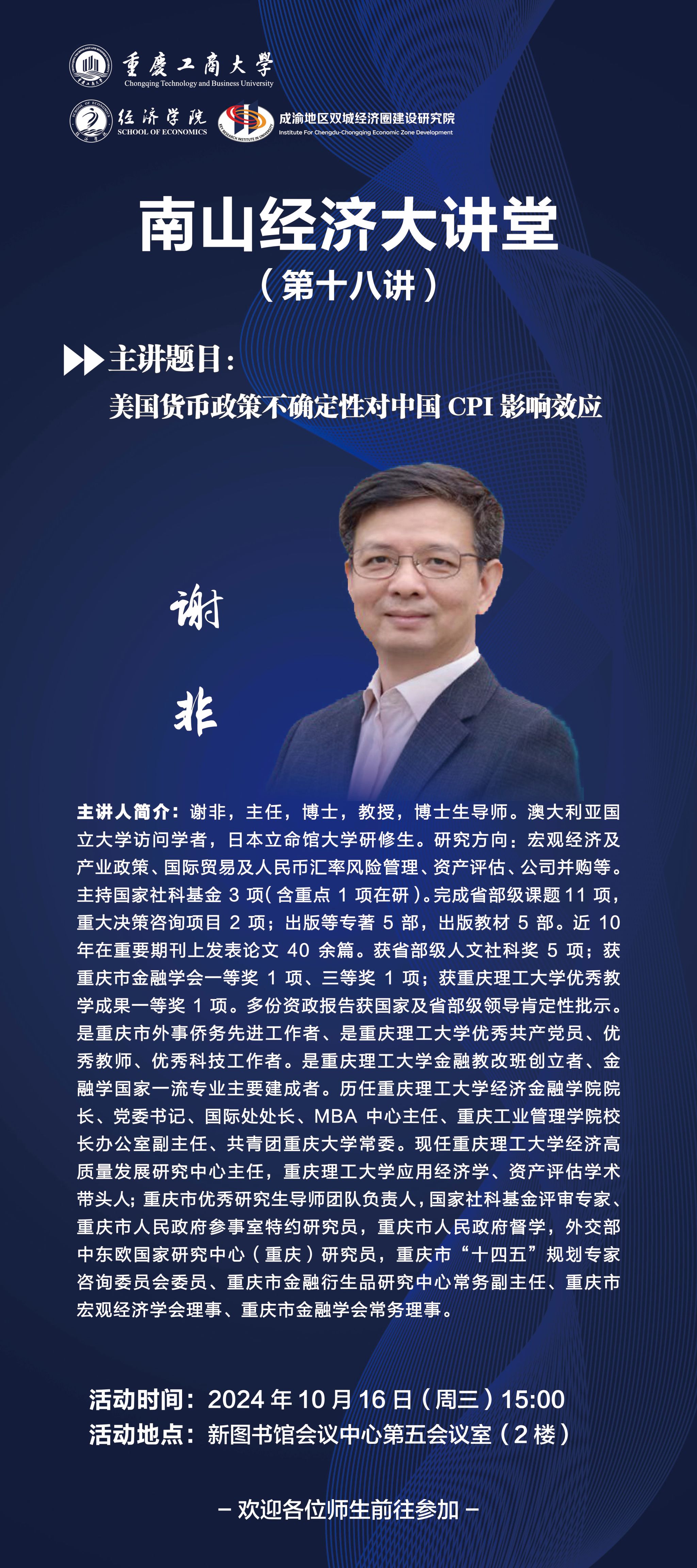 主讲人简介:谢非,主任,博士,教授,博士生导师。澳大利亚国立大学访问学者,日本立命馆大学研修生。研究方向:宏观经济及产业政策、国际贸易及人民币汇率风险管理、资产评估、公司并购等。主持国家社科基金 3 项(含重点 1 项在研)。完成省部级课题11 项,重大决策咨询项目 2 项;出版等专著 5 部,出版教材 5 部。近 10 年在重要期刊上发表论文 40 余篇。获省部级人文社科奖 5 项;获重庆市金融学会一等奖 1 项、三等奖 1 项;获重庆理工大学优秀教学成果一等奖 1 项。多份资政报告获国家及省部级领导肯定性批示。是重庆市外事侨务先进工作者、是重庆理工大学优秀共产党员、优秀教师、优秀科技工作者。是重庆理工大学金融教改班创立者、金融学国家一流专业主要建成者。历任重庆理工大学经济金融公司经理、党委书记、国际处处长、MBA 中心主任、重庆工业管理公司董事长办公室副主任、共青团重庆大学常委。现任重庆理工大学经济高质量发展研究中心主任,重庆理工大学应用经济学、资产评估学术带头人;重庆市优秀研究生导师团队负责人,国家社科基金评审专家、重庆市人民政府参事室特约研究员,重庆市人民政府督学,外交部中东欧国家研究中心(重庆)研究员,重庆市“十四五”规划专家咨询委员会委员、重庆市金融衍生品研究中心常务副主任、重庆市宏观经济学会理事、重庆市金融学会常务理事。