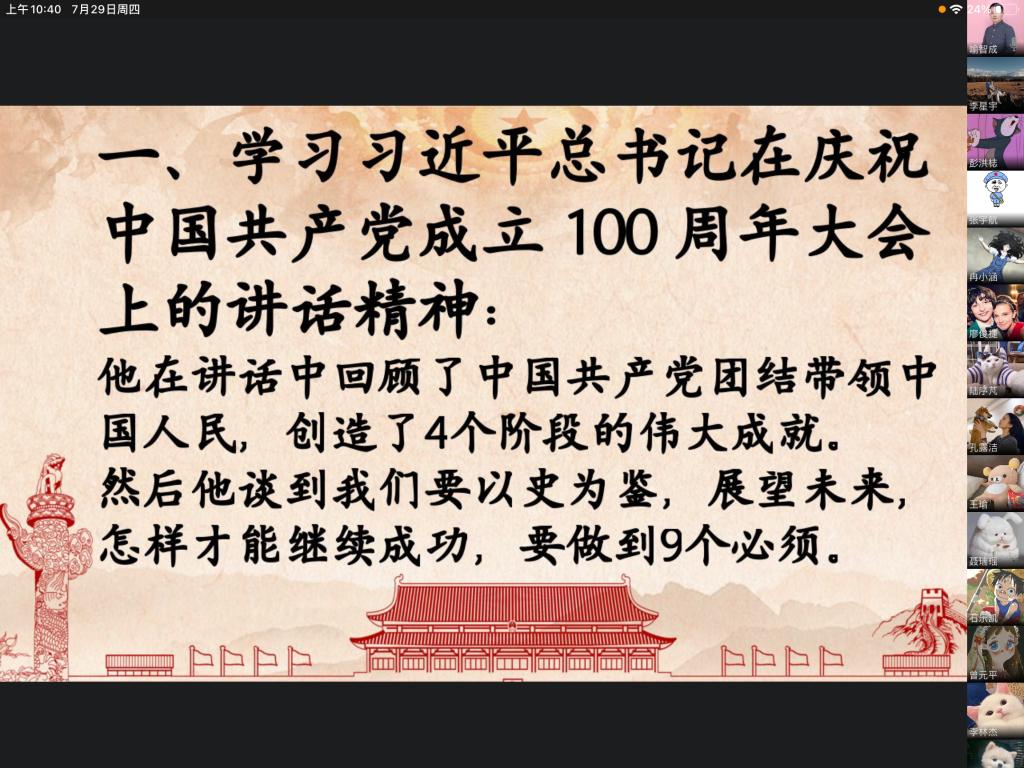 2021年7月29日,员工二支部全体党员通过企业微信学习了习近平总书记在庆祝中国共产党成立 100 周年大会上的讲话精神,会议由支部书记喻智成老师主持,支部全体党员参加会议。