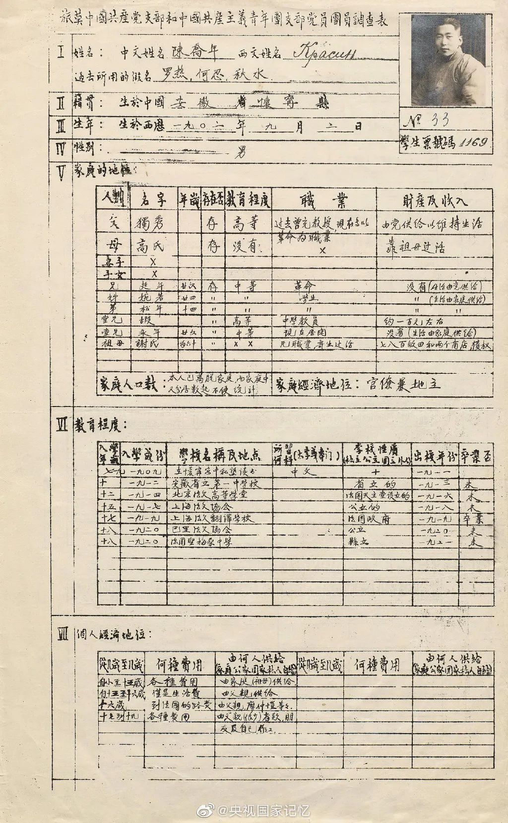 近日,中国历史研究院征集海外中共珍稀文献展,首度公开陈乔年履历表。在这份履历表中,我们可以清楚地看到,陈乔年于1902年9月2日出生在安徽怀宁,父亲是“新文化运动”领袖陈独秀。