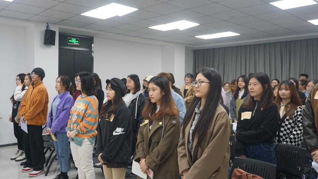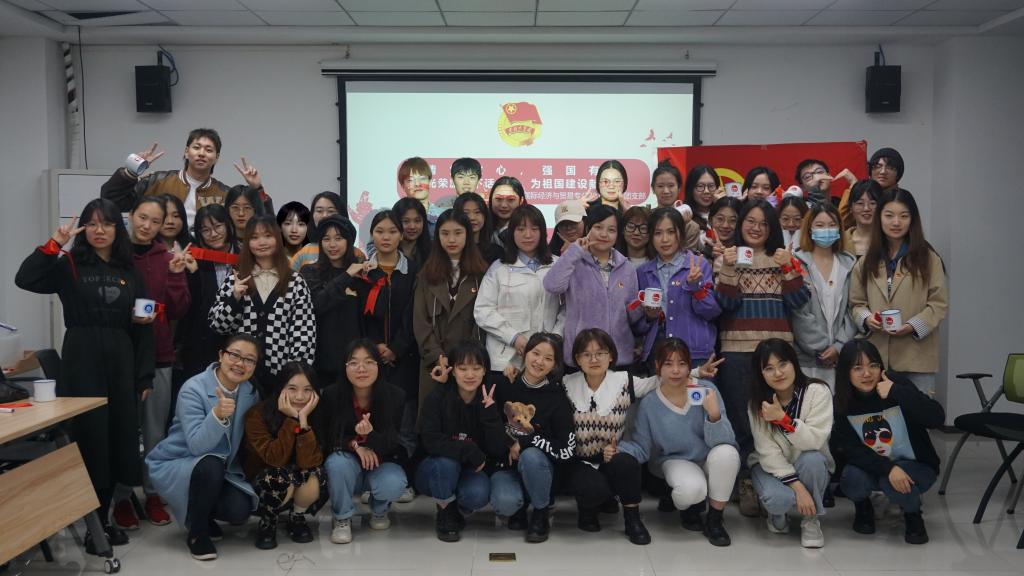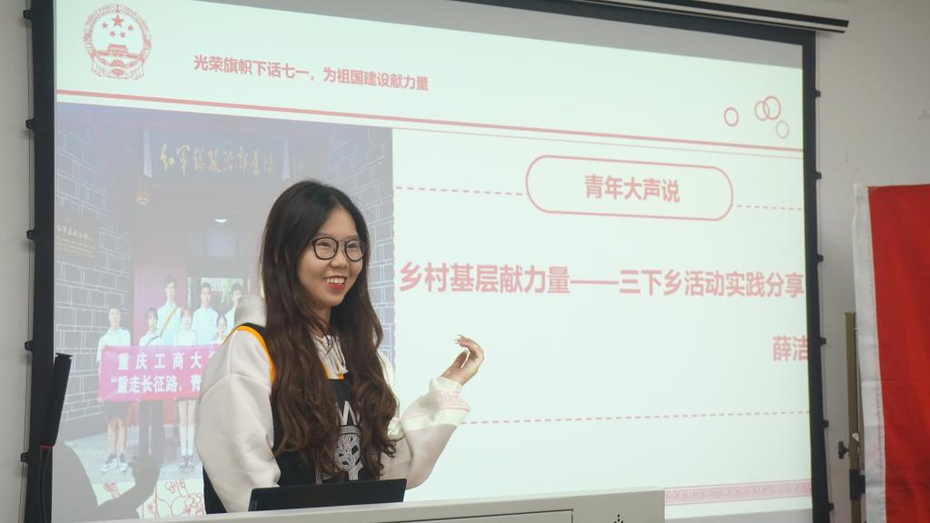 最后,团支部内优秀的青年团员进行了暑期专业实习以及三下乡活动的分享。薛洁同学分享了三暑期时跟随公司三下乡实践团队,深入红色圣地遵义的乡村基层,走访调查,理论宣讲,服务社会的经历,得到了当地群众及社会的认可;梁颜和杜欣蔚同学则是讲述了暑期参与重庆西朗进出口贸易公司举办的“Z世代VINI商业旅行家夏令营”的宝贵实习经历,激励大家不能局限眼界,更多的走出校园,亲身去实践探索属于自己的天地。每位青年还写下了自己对于祖国的寄语和对自己未来的期许,留下了作为新世代的承诺。