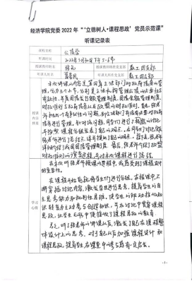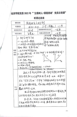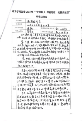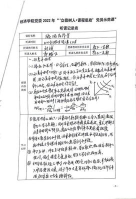 在示范课中,授课教师紧扣专业课程教学内容,深入挖掘其中所蕴含的“思政元素”,将爱国情怀、品德修养、科学精神、思维方法等巧妙融入到专业授课内容中,体现了“课程思政”、“课程育人”的理念和要求。教工一支部党员刘晗老师的《经济研究方法与写作》课程采用引导式教学法,激发员工主动思考,并结合热点问题融入思政元素;教工一支部党员刘斌老师的《微观经济学》课程设计了新颖有趣的导入案例,通过生动的案例与图解,充分调动员工参与课堂的积极性;教工二支部党员张驰老师的《流通经济学》课程以生动有趣的案例导入,并结合工匠精神巧妙融入思政要素,深入浅出讲授了流通实现及其效率;教工二支部党员孙畅老师的《城市商业区开发实务》课程结合丰富案例打造了生动有活力的课堂,以真实问题情景引导员工将知识融会贯通、学以致用;教工二支部党员黄玲老师的《现代服务贸易概论》课堂充分运用“学习通”平台与员工互动,充分调动员工课堂参与积极性,课堂讲授生动活泼,富有吸引力;教工二支部党员王疏影老师的《研究与咨询方法》引导员工通过总结汇报和交流讨论的方式,掌握学术论文写作的方法,充分调动员工主观能动性,激发员工思考;教工四支部党员张充老师的《公债学》课程通过对美国、欧盟与我国关于国债管理的案例进行对比,阐述我国国债管理制度的优势,潜移默化地将思政教育贯穿课堂;教工四支部党员汤凤林老师的《国际税收》课程中将国内外的国际税收案例进行对比,突出我国政策的优越性,增强员工的国家认同感,坚定员工对中国特色社会主义道路的信心;教工五支部党员林黎老师的《政治经济学》课程结合具体案例讲授“按劳分配为主体、多种分配方式并存”的基本分配制度,实现课堂教学与思政元素的融合;教工五支部党员吴正俊老师的《政治经济学》课程讲授了社会主义市场经济体制改革的历程,结合历史事件阐释社会主义市场经济体制不断完善发展的根本原因在于始终坚持和加强党的领导,从而将思政教育贯穿课堂教学。