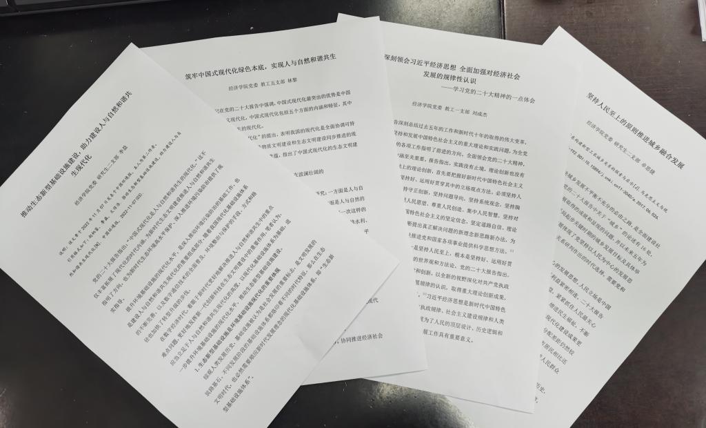 教工一支部刘晗老师以“以习近平经济思想为引领,推动高质量发展迈上新台阶”为题,从习近平经济思想中笃定经济长期持续向好的信念,领悟经济高质量发展的必要性,把握推进高质量发展的着力点这三个方面展开论述,强调要认真学习和领会习近平经济思想的深刻内涵,坚定不移地推动高质量发展迈上新台阶。研究生二支部李益同学以“推动生态新型基础设施建设,助力建设人与自然和谐共生现代化”为题,针对党的二十大报告中“中国式现代化是人与自然和谐共生的现代化”这一重要论述,认为应当立足于人与自然和谐共生现代化的高度,以现代化基础设施体系为基础,进一步提升环境基础设施的现代化水平,推动生态新型基础设施建设。研究生一支部熊豪同学以“鲜衣怒马少年时,不负韶华行且知”为题,深入领会习近平总书记在党的二十大报告中对青年的寄语,号召新一代青年“仰望星空,脚踏实地,不忘初心坚定行;刻苦专研,锐意进取,宝剑锋从磨砺出;敢想敢为,善作善成,直挂云帆济沧海”。研究生二支部卓思捷同学以“坚持人民至上的原则推进城乡融合发展”为题,针对二十大报告中关于城乡发展的论述,认为坚持人民至上的原则推进城乡融合发展体现了党坚持以人民为中心的发展思想,是党基于最广大人民群众利益和对城乡关系研判作出的时代选择。研究生一支部张金牛同学表示,综观古今中外,我们党是最讲团结、最能奋斗的最先进政治力量,要以更加紧密的团结、更加顽强的奋斗,把民族复兴的历史伟业不断推向前进。