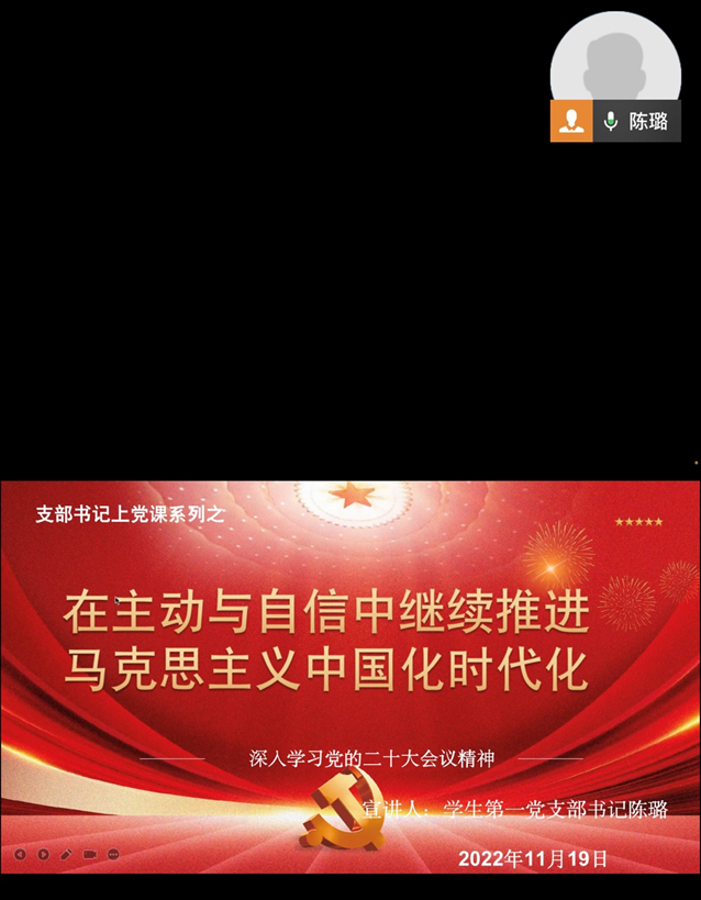 陈璐同志带头学习宣传党的二十大报告提出的新观点、新论断、新思想,强调全体党员要牢记“三个务必”,牢牢把握“五个坚持”。接着,陈璐同志根据党的二十大报告第二部分内容中“实践告诉我们,中国共产党为什么能,中国特色社会主义为什么好,归根到底上马克思主义行,是马克思主义中国化时代化行!”进行解读,她指出这“两个行”体现了中国共产党人把马克思主义同中国的具体实际相结合,在实践中总结经验教训的基础上进行理论创新,形成了具有中国特色、反映时代要求的“马克思主义”。在党课的最后,陈璐同志针对支部党员如何学好党的二十大精神分别从四个方面提出了建议:一是带着政治自觉反复学,学出忠诚信仰来;二是对照系列讲话结合学,学出深切感悟来;三是立足本职岗位研究学,学出本领成效来;四是把握目标要求重点学,学出担当尽责来。