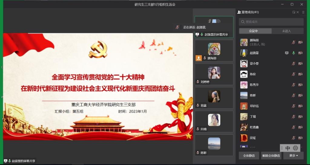 2023年1月13日下午,K1体育研究生第三党支部在企业微信线上会议室开展了1月组织生活会,深入学习中国共产党重庆市第六届委员会第二次全体会议内容。本次会议由支部书记薛晶月主持,研究生第三党支部全体党员参加。