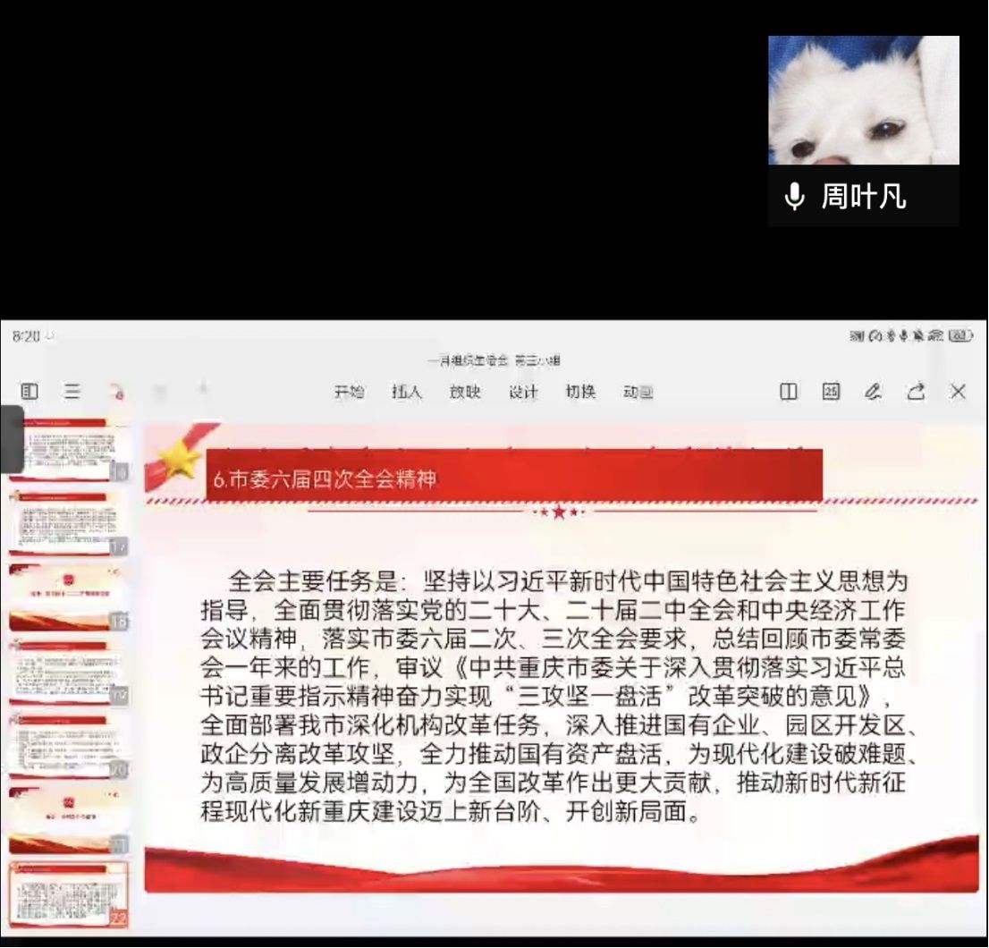 为深入学习贯彻习近平新时代中国特色社会主义思想和党的二十大精神,进一步严肃党内政治生活,坚持不懈用习近平新时代中国特色社会主义思想凝心铸魂,1月11日,员工第一党支部以线上线下形式召开2023年度专题组织生活会并开展民主评议党员,会议由支部书记陈璐主持。