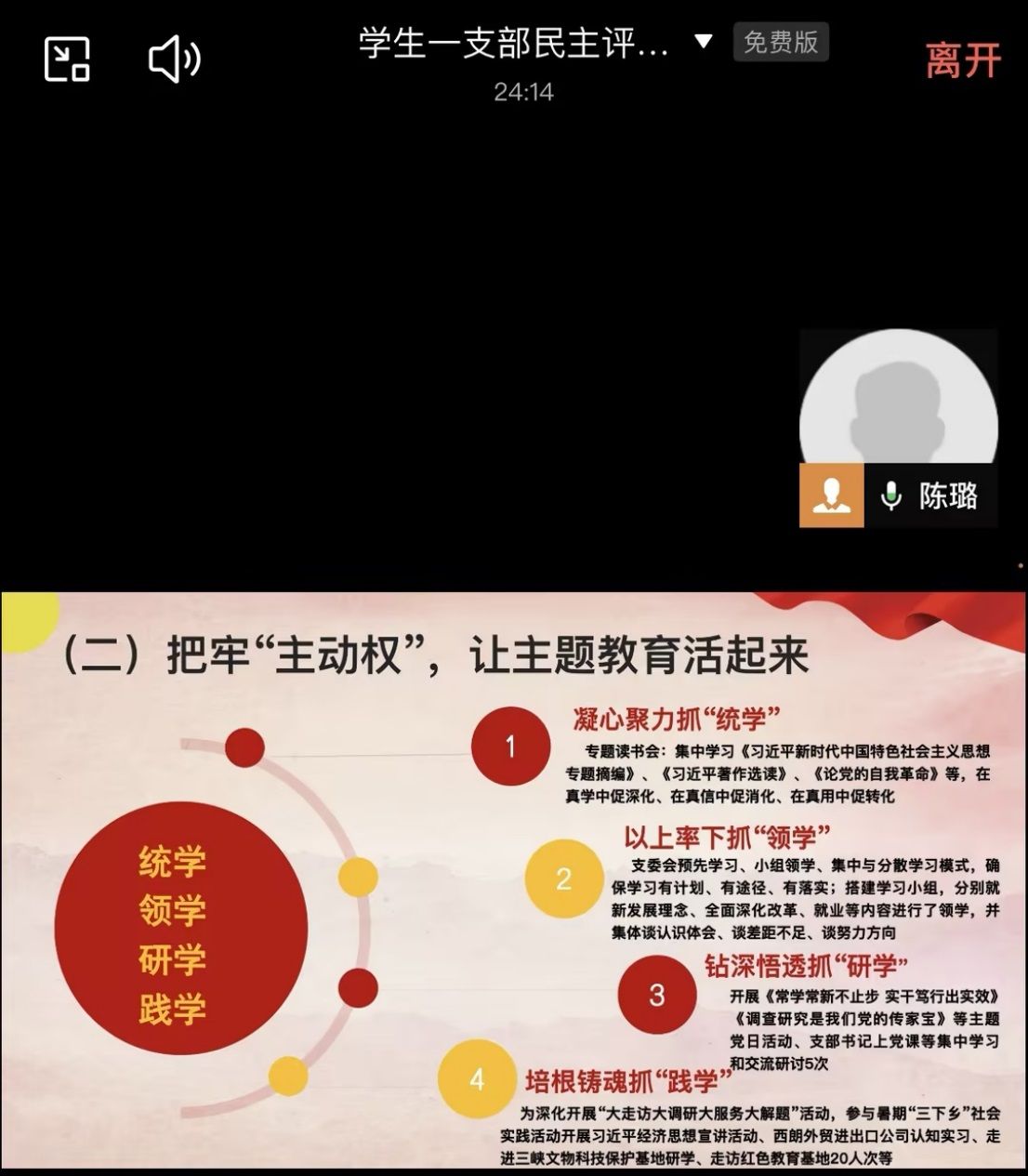 民主评议会后,学习小组组织全体党员集中学习了《中共中央政治局12月8日会议精神》、《中央经济工作会议精神》、《习近平在视察武警海警总队东海海区指挥部时的重要讲话精神》、《习近平在广西考察时的重要讲话精神》、《国家主席习近平二〇二四年新年贺词》、《重庆市委六届四次全会精神》等内容,强调要以习近平新时代中国特色社会主义思想为指导,坚持稳中求进工作总基调,完整、准确、全面贯彻新发展理念,加快构建新发展格局,着力推动高质量发展。