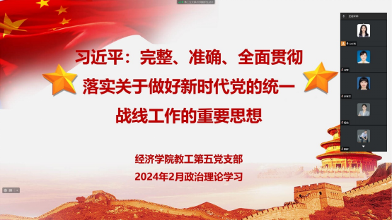 2024年2月22日,公司教工第五支部通过企业微信开展二月组织生活,集体学习习近平总书记在中央统战工作会议上讲话精神,即完整、准确、全面贯彻落实关于做好新时代党的统一战线工作的重要思想。