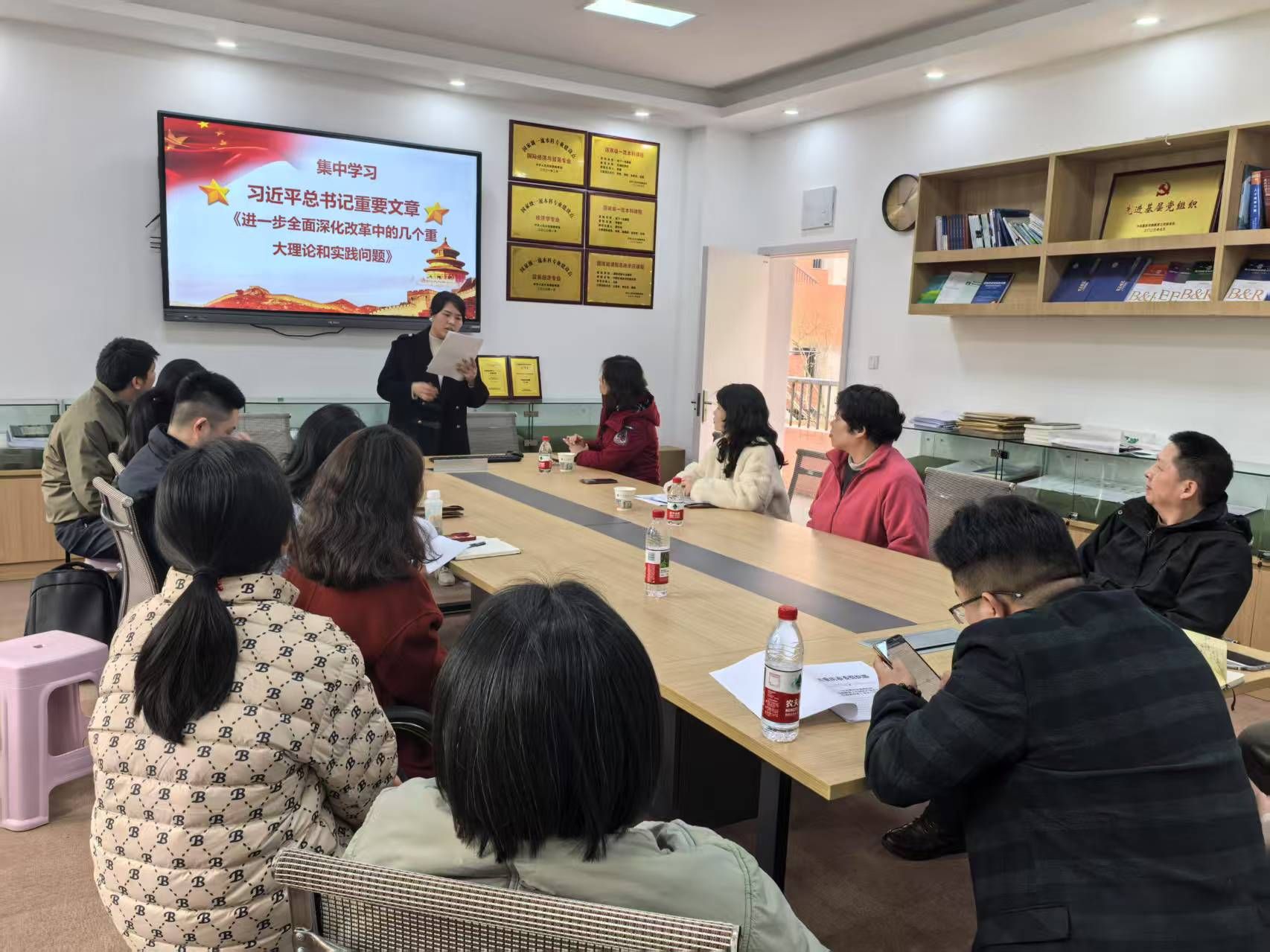 学习小组成员程莉老师从新时代全面深化改革取得的历史成就、坚持守正创新、坚持用科学方法指导和推进改革及营造改革良好气氛等4个方面,引领支部全体党员集中学习习近平总书记发表于《求是》的重要文章《进一步全面深化改革中的几个重大理论和实践问题》。学习小组成员黎巧老师表示,对我国新时代全面深化改革取得的历史成就感到振奋鼓舞,将不断加强学习和领悟坚持守正创新和用科学方法指导和推进改革相关理论和实践成果。学习小组成员赖辉老师认为,中央工作会议提出2025年我国将进一步推动全面深化改革举措落实落地,结合重庆本地在全面推进“三攻坚一盘活”的改革实践和成效成果,需要不断加强理论学习才能为地方政府、国企和园区的深化改革提供智库支持。