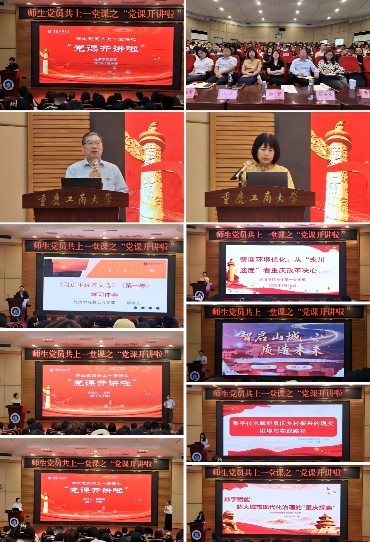 活动第二个环节围绕“习近平经济思想的重庆实践”展开,四位员工党员结合重庆地方经济发展实际进行党课宣讲,两位教工党员进行点评。员工一支部陈曦以《营商环境优化:从‘永川速度’看重庆改革决心》为题,结合习近平经济思想中“支持民营经济发展”的论述,阐述了优化营商环境对激发市场活力,推动经济高质量发展的重要性。员工二支部徐睿以《智启山城 质造未来——制造业‘33618’集群体系的智造跃迁》为题,分析了重庆“33618”现代制造业集群建设的显著成绩和未来蓝图,阐述了科技创新在培育经济增长新动能方面的核心作用。研究生一支部王敏以《数字技术赋能重庆乡村振兴的现实困境与实践路径》为题,探讨数字技术在乡村振兴中的应用,诠释了习近平经济思想的创新发展理念。研究生二支部秦浩宇以《数字赋能:超大城市现代化治理的“重庆探索”》为题,介绍了数字赋能重庆智慧治理的背景、实践、挑战和未来规划,展现了数字经济在提升城市治理效能、推动经济高质量发展中的关键作用。教工五支部吴燕老师和教工一支部肖伶俐老师在点评中指出,党课紧密结合国家战略与重庆实际,展现了习近平经济思想的实践运用,并鼓励同学们将专业知识与地方发展需求结合,为数字重庆建设和乡村振兴贡献智慧力量。