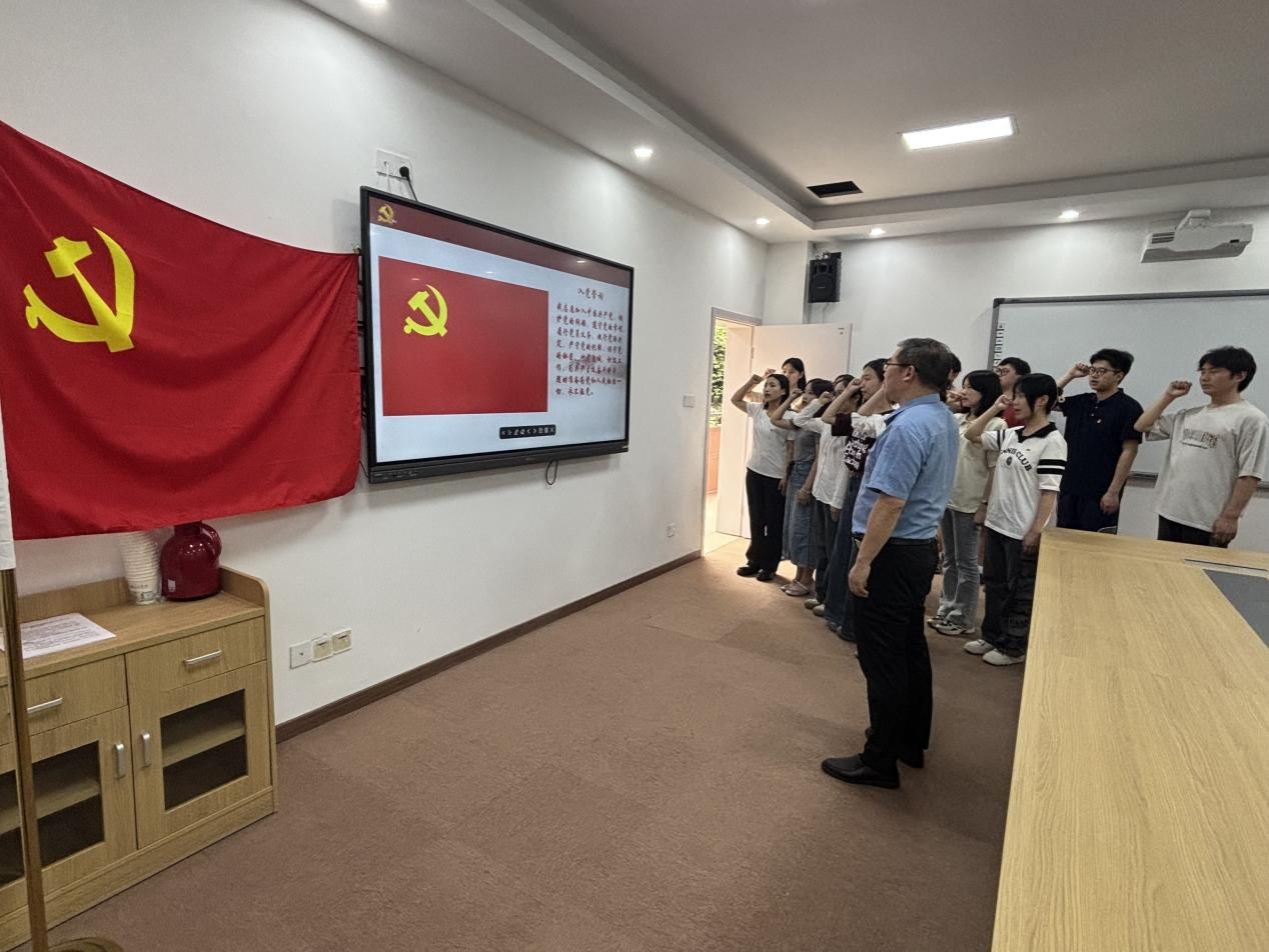 首先,各员工支部书记为新党员逐一佩戴党徽。随后,在唐春秋书记的带领下,全体新党员面对党旗,紧握右拳,以铿锵有力的声音庄严宣誓,表达了对党的忠诚与承诺。