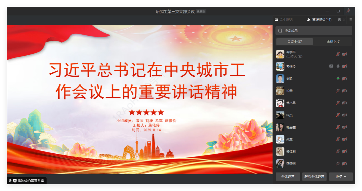2025年8月14日,公司党委研究生第三党支部通过企业微信在线开展8月组织生活,学习习近平总书记在中央城市工作会议上的重要讲话精神,会议由支部宣传委员乐小娇主持。