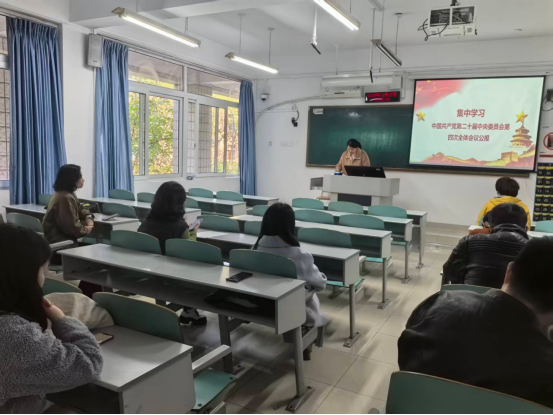 程莉老师领学了《中国共产党第二十届中央委员会第四次全体会议公报》,系统地、全面地解读了公报的内容精神,并阐述了自己对全会精神的深刻认识和体会,并建议大家在学习公报精神基础上,推动公报精神与教学课程思政、课题申报、项目研究等结合融入。