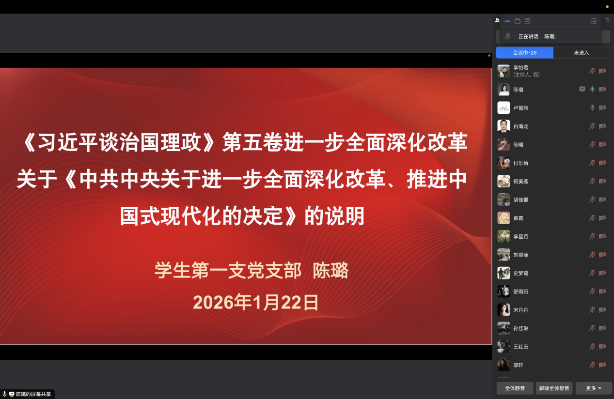 会议伊始,第五学习小组邬轩同志带领全体党员主要学习了习近平总书记在中央政治局会议、在党外人士座谈会上、在中央经济工作会议上的重要讲话精神,同时学习了习近平总书记重要文章《扩大内需是战略之举》、国家主席习近平二〇二六年新年贺词、习近平总书记对未成年人思想道德建设作出的重要指示精神以及对做好“三农”工作作出的重要指示精神核心要义,引导党员们把握时代脉搏,凝聚奋进共识。