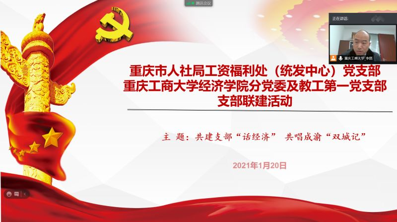2021年1月20日上午,K1体育分党委同市人社局工资福利处(统发中心)党支部在腾讯会议上在线开展了主题为“共建支部‘话经济’,共唱成渝‘双城记’”的支部联建活动,市人社局工资福利处程卫民处长、人社局规划财务处谷亚处长、人社局直属机关党办胡剑主任、市机关事业单位工资统发中心宋晓辉主任、K1体育分党委李自维书记、正处级组织员雷菁委员、市人社局工资福利处(统发中心)党支部和K1体育分党委教工第一党支部全体党员近60人参加了会议。