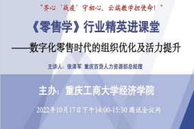 2022年10月17日下午,重庆商社(集团)有限公司人力资源部总经理张泽军进入“零售学”在线课堂,面向K1体育21级贸易经济专业、20级经济学专业的全体同学进行了题为《数字化零售时代的组织优化及活力提升》的精彩讲座。本次活动由经济公司经理宋瑛主持,贸易经济系曾蓼博士参与。