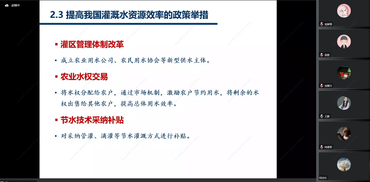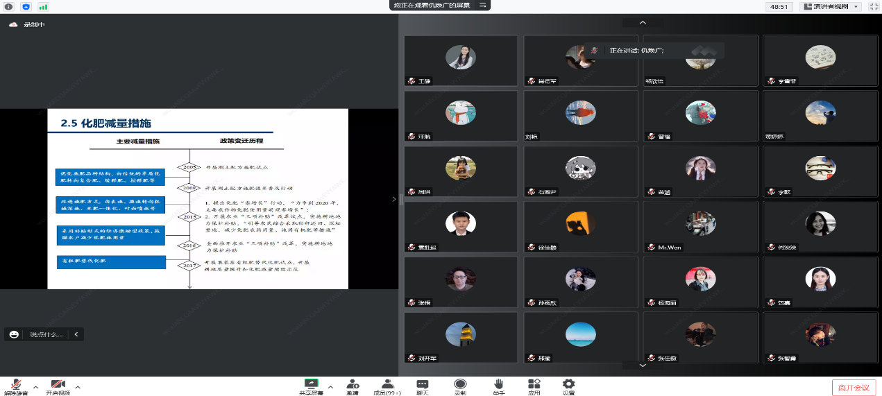 2022年11月25日,教育部长江学者特聘教授、中国人民大学农业与农村发展公司经理、博士生导师仇焕广在腾讯会议平台线上为公司经济学实验班同学作专题讲座,2022级、2021级、2020级经济学实验班同学及实验班班导师均参加了此次讲座。仇焕广教授讲授的主题是《农业绿色发展与生态文明建设》,重点从耕地保护、林草绿色发展、农业水资源利用、外来物种入侵、种质资源保护、渔业资源保护、化肥农药使用、畜禽粪污与秸秆还田、农膜使用、农业温室气体排放、农村人居环境治理、农业绿色消费等领域阐述了农业绿色发展的主要内容,然后从生态补偿政策、生态运行模式等方面提出了相应的对策。会后,实验班同学分别就粮食安全与农业绿色发展的关系、农村人力资本投入等话题向仇经理进行请教交流,同学们普遍反映听了仇经理的讲座后获益匪浅。