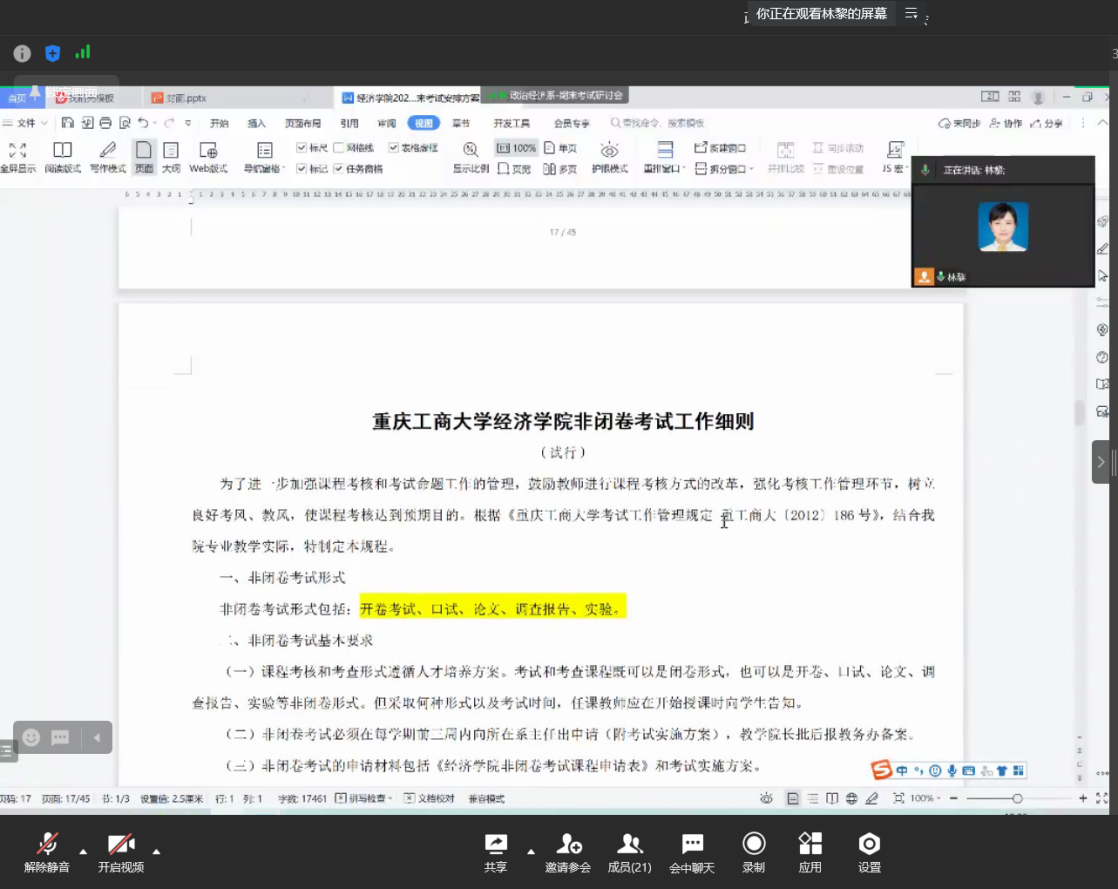 接着,林黎主任带领全系老师领学了《2022年秋季课程考核工作方案》和《K1体育非闭卷考试工作原则》等重要文件,分别对开卷考试、口试、论文、调查报告以及实验考试等非标准答案考核形式进行了详细介绍。林黎提醒各位老师在非标准答案考核方式下,应当把握好考试题目难度,充分考察员工的学习效果。