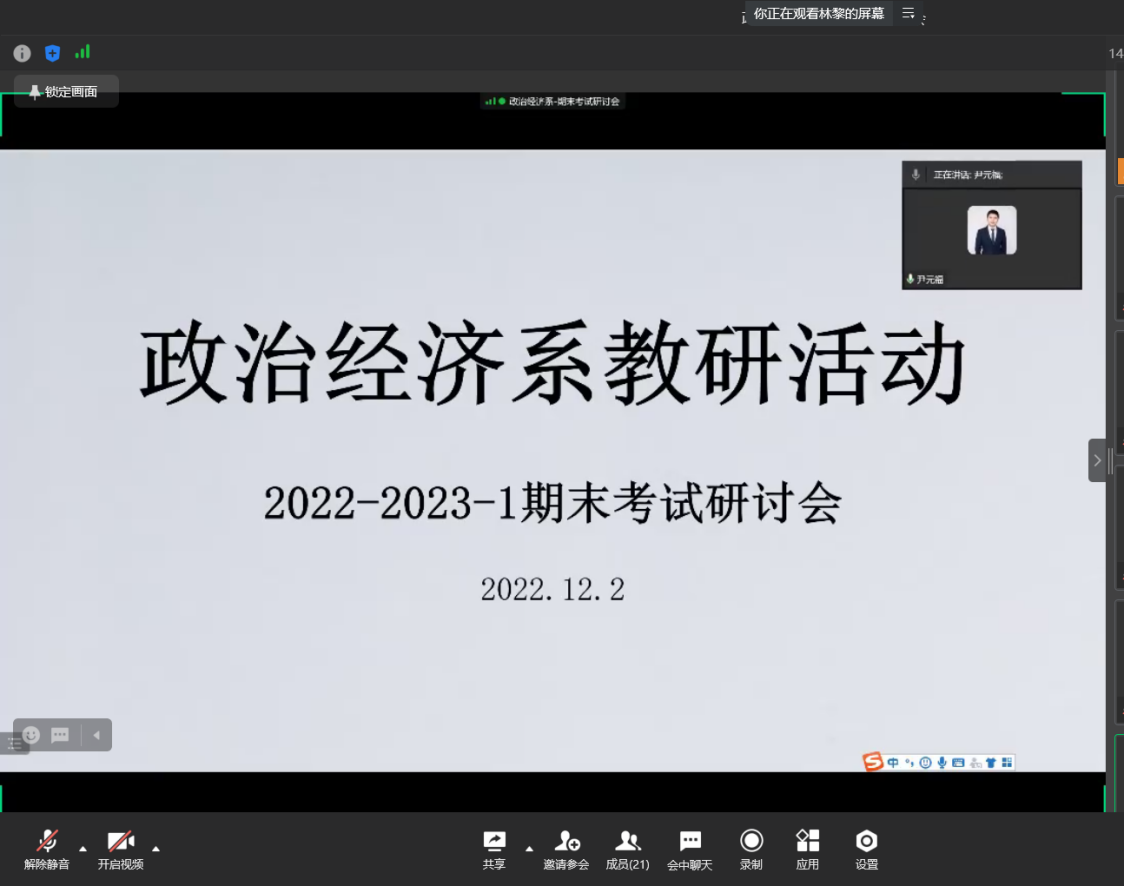 为保障疫情期间期末考试的顺利开展,12月2日晚上,K1体育政治经济系通过企业微信召开了期末教研会。参加此次会议的有K1体育尹元福副经理以及政治经济系全体教师,会议由政治经济系主任林黎主持。