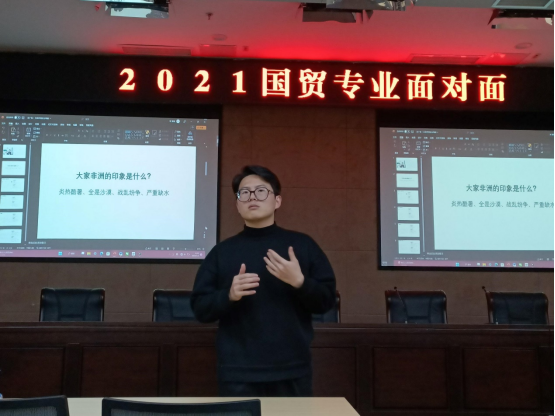 随后,“专业面对面之学姐学长有话说”环节,2017级优秀学长梁广南,2017级优秀学姐田海燕以及2018级优秀学长孙清豪受邀来到活动现场,以他们生动的案例给学弟学妹们提供成长的指引。2018级学长孙清豪,现就读于公司国际商务专硕,为同学们讲述了公司国际商务考研以及专硕学习等相关情况。2017级学姐田海燕,现就职于重庆西朗进出口贸易有限公司高级业务员专员,分享了她的工作经历以及工作感受并且回顾了自己的大学时代,以亲身经历建议同学们在大学中要主动找寻自己感兴趣的事情,要不断的去学习和尝试。2017级学长梁广南(原供职森大集团,驻非洲肯尼亚1年半)则分享了自己海外工作与生活经历,希望同学们积极拓展眼界,去正确认识世界,增加辨别能力;他建议同学们在大二阶段可以认真思考自己的规划以及理想目标,根据达成目标所必需的要求实现自我约束与提升,也要学会爱惜自己,最终为自己的老员工活交付一份满意的答卷。