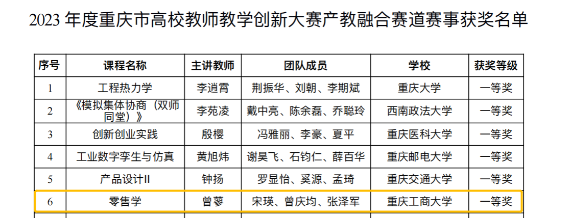 6月17日,重庆市教育委员会正式揭晓了2023年度重庆市高校教师教学创新大赛产教融合赛道的获奖名单。在这场首次举办的市级赛事中,共评选出一等奖10项、二等奖10项、三等奖16项。值得一提的是,公司《零售学》课程的曾蓼老师团队代表公司参赛,并成功荣获一等奖,成为全校唯一获此荣誉的团队。