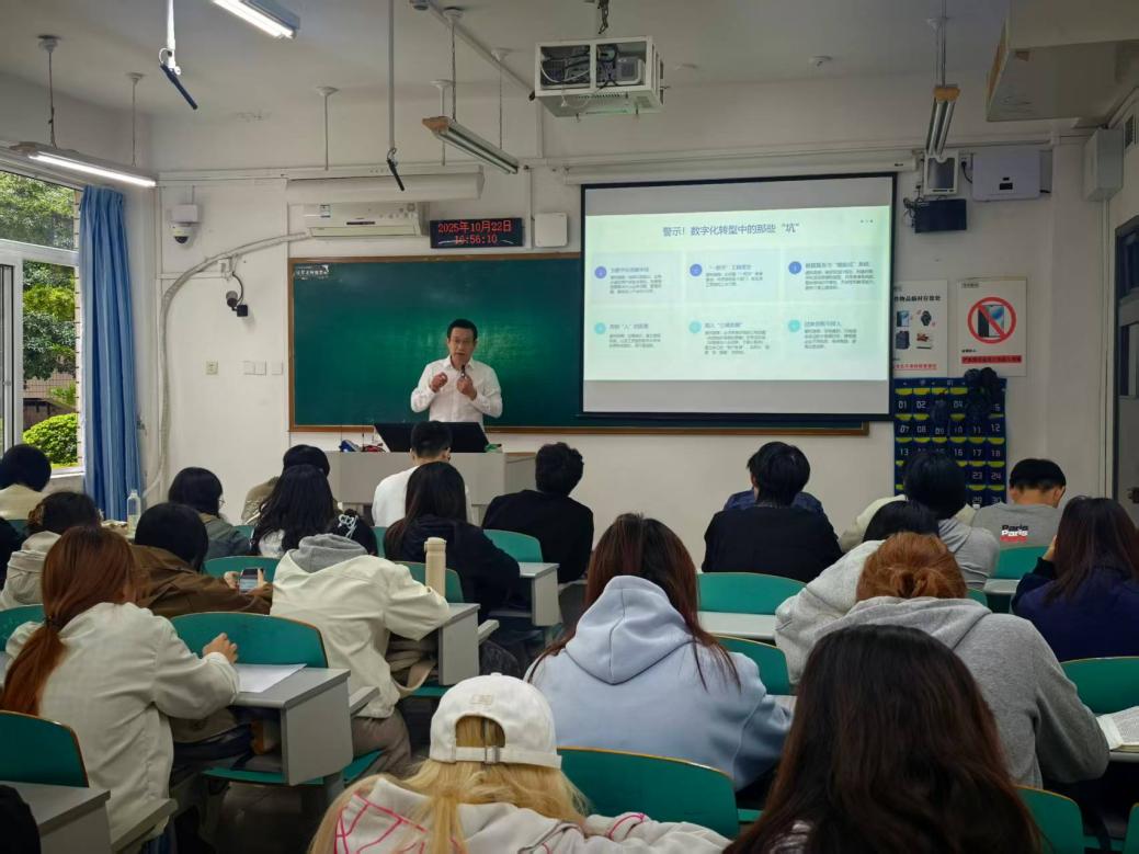 张泽军以《老树长新枝——重庆百货的数字化转型之路》为主题,从重庆百货的百年传奇讲起,讲述了在时代浪潮的冲击下,传统零售巨头如何通过数字化转型实现从线下巨轮到全域零售的华丽转身。他详细解读了重庆百货数字化转型的“四部曲”:营销与渠道数字化、商品与供应链数字化、管理与流程数字化以及数据驱动决策,让同学们对零售行业的数字化转型有了清晰且全面的认识。此外,他还分享了数字化转型中的“避坑指南”,为同学们未来进入行业提出极具价值的建议。
