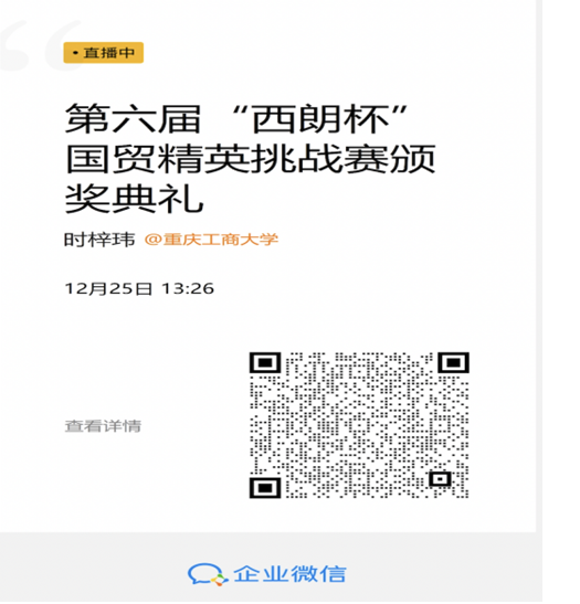 颁奖典礼上,由于带领团队外出学习而未能出席大赛的大赛赞助商、公司国贸专业实践教学基地——重庆西朗进出口贸易有限公司创始人刘丹、粟小亚和黄师傅通过短视频表达了对参赛同学的祝福。