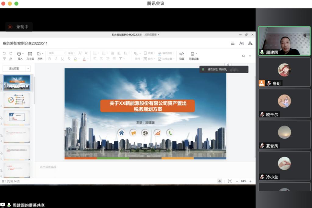 2022年5月13日晚,公司税务硕士教育中心通过腾讯会议成功举办了主题为“关于重庆XX新能源股份有限公司资产置出税务规划方案”的税收筹划专题课程移动课堂。此次移动课堂有幸邀请到中税网天运(重庆)税务师事务所经理周建国来做分享交流,周老师同时也是公司税务专业硕士事业导师。移动课堂由公司汤凤林老师主持,公司2021级税务专业硕士的同学们积极参加了本次移动课堂。
